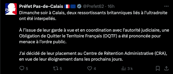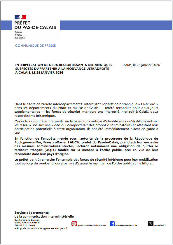 Leur arrestation conduit la préfecture du Pas-de-Calais à prolonger l’interdiction de l’opération Overlord jusqu’au mercredi 28 janvier à 08h00. Grant & co terminent en CRA à Coquelles et décrochent une OQTF.